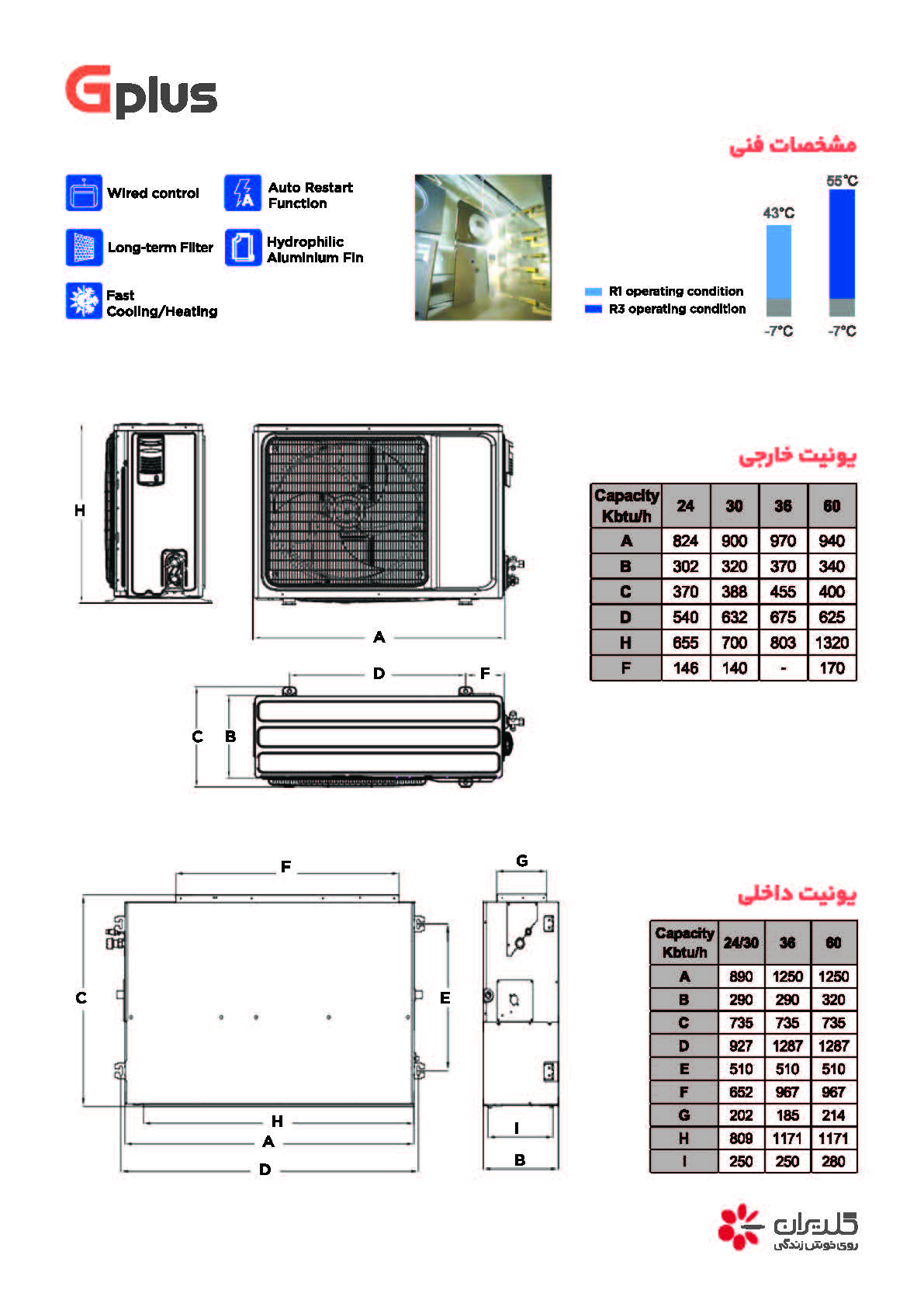 داکت اسپلیت سرد و گرم جی پلاس (Gplus) برای تامین گرمایش بهتر محیط، امکان اتصال به کویل آب گرم را دارد. داکت اسپلیتهای سقفی توکار جی پلاس همچنین مجهز به تکنولوژی کنترل فشار استاتیک خارجی هستند که با استفاده از آن به راحتی میتوانید حجم هوای خروجی دستگاه را از طریق ریموت کنترل، تنظیم نمایید. موتور BLDC داکت اسپلیت سقفی توکار جی پلاس، علاوه بر داشتن امکان کنترل فشار استاتیک خارجی میتواند سرعت فن و حجم هوا را نیز کنترل کند؛ از این رو برای کنترل هوا نیازی به تجهیزات اضافه نخواهد بود. یکی دیگر از ویژگیهای داکت اسپلیت جی پلاس، سطح صدای پایین آن است که باعث شده تا این دستگاه جزو داکت اسپلیتهای کم صدای بازار به شمار آید. همچنین این دستگاه مجهز به فیلتر قابل شستشو نیز می باشد.